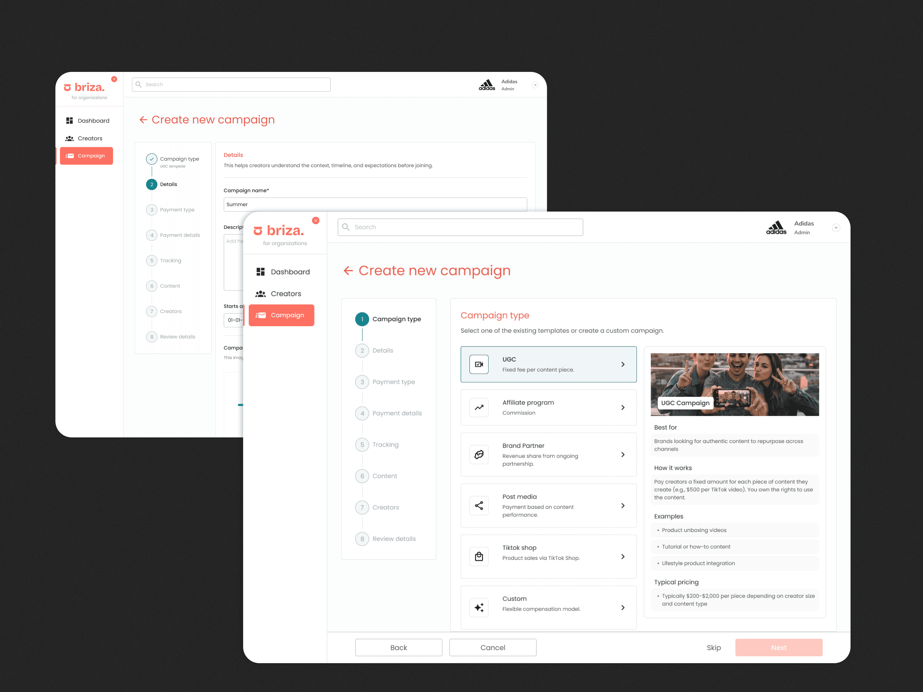 The campaign creation flow was the hardest design challenge. Brands need to configure campaign type, payment models, tracking, content specs, and creator approval, all at once. We broke it into an 8-step guided flow where each step owns a single concern. All steps are skippable and fully editable after launch.